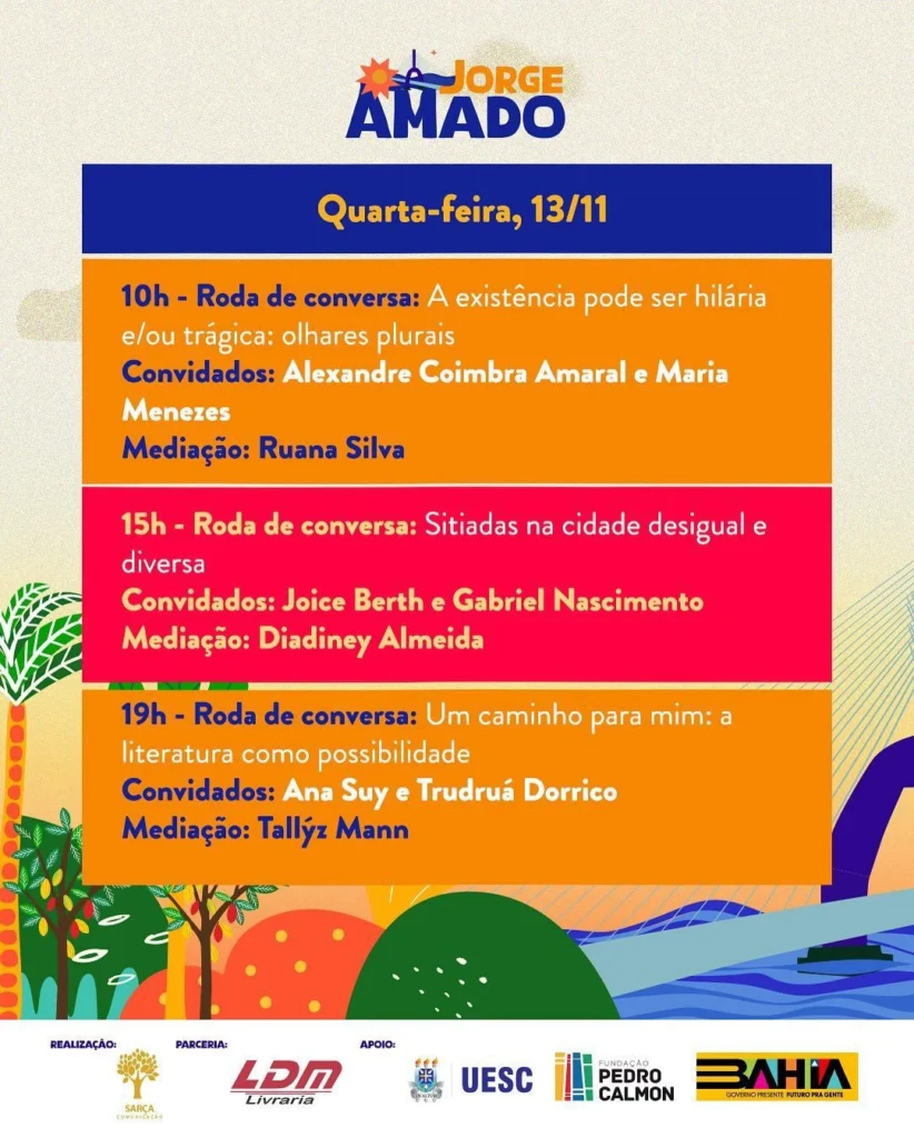 13/11 – 10h. Roda de conversa: A existência pode ser hilária e/ou trágica: olhares plurais. Convidados: Alexandre Coimbra Amaral e Maria Menezes, com mediação de Ruana Silva.