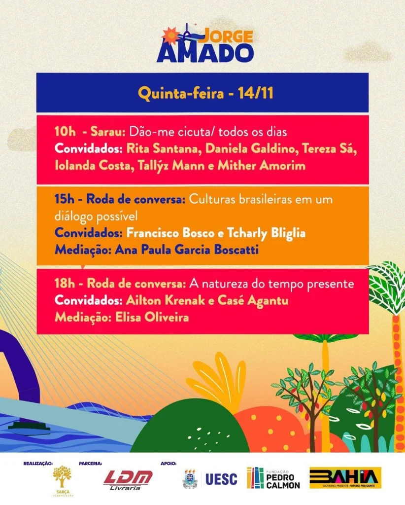 14/11 – 10h. Sarau: Dão-me cicuta / todos os dias. Convidados: Rita Santana, Daniela Galdino, Tereza Sá, Iolanda Costa, Tallýz Mann e Mither Amorim